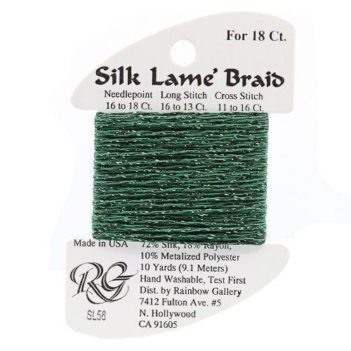 This is Silk Lame Braid 18 from Rainbow Gallery in color 058 Dark Christmas Green. A great thread for adding sparkle to 18 mesh projects. Use as-is on 18 mesh.