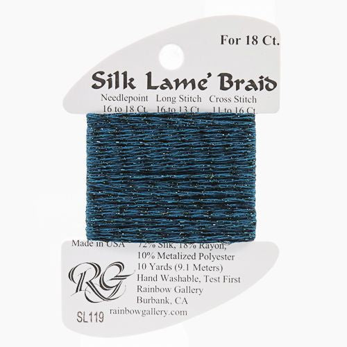 This is Silk Lame Braid 18 from Rainbow Gallery in color 119 Blue Sapphire. A great thread for adding sparkle to 18 mesh projects. Use as-is on 18 mesh.