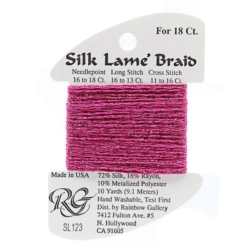 This is Silk Lame Braid 18 from Rainbow Gallery in color 123 Dark Hot Pink. A great thread for adding sparkle to 18 mesh projects. Use as-is on 18 mesh.