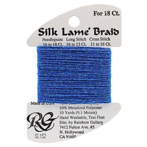 This is Silk Lame Braid 18 from Rainbow Gallery in color 152 Hawaiian Blue. A great thread for adding sparkle to 18 mesh projects. Use as-is on 18 mesh.