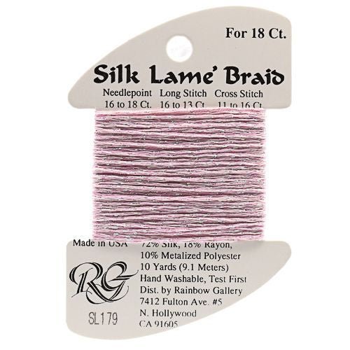 This is Silk Lame Braid 18 from Rainbow Gallery in color 179 Cotton Candy. A great thread for adding sparkle to 18 mesh projects. Use as-is on 18 mesh.