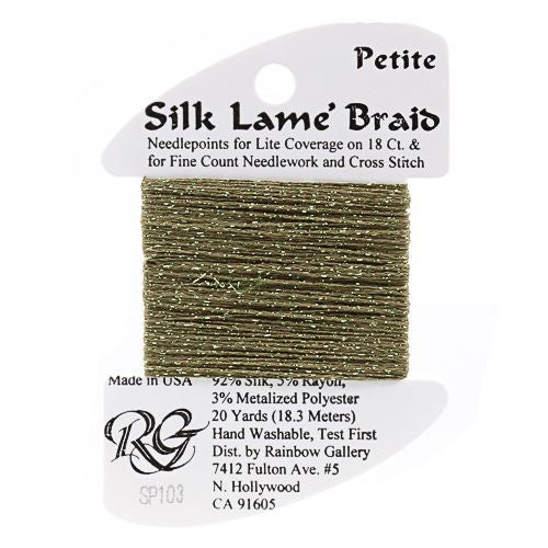 This is Silk Lame Braid Petite from Rainbow Gallery in color 103 Olive. Use on 18 mesh for light coverage, or with a floss as a blending filament. 2 strands of Silk Lame Braid Petite are approximately equivalent to one strand of Silk Lame Braid 18.