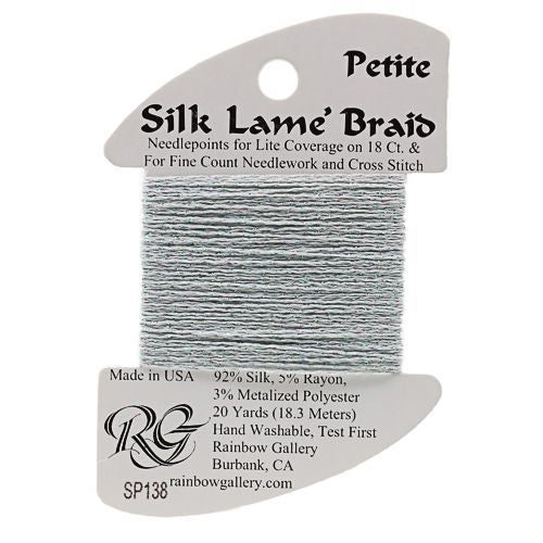 This is Silk Lame Braid Petite from Rainbow Gallery in color 138 Glacier. Use on 18 mesh for light coverage, or with a floss as a blending filament. 2 strands of Silk Lame Braid Petite are approximately equivalent to one strand of Silk Lame Braid 18.