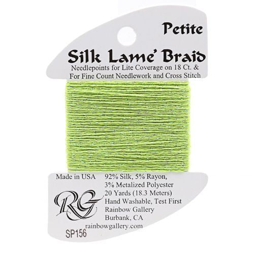 This is Silk Lame Braid Petite from Rainbow Gallery in color 156 Kiwi. Use on 18 mesh for light coverage, or with a floss as a blending filament. 2 strands of Silk Lame Braid Petite are approximately equivalent to one strand of Silk Lame Braid 18.
