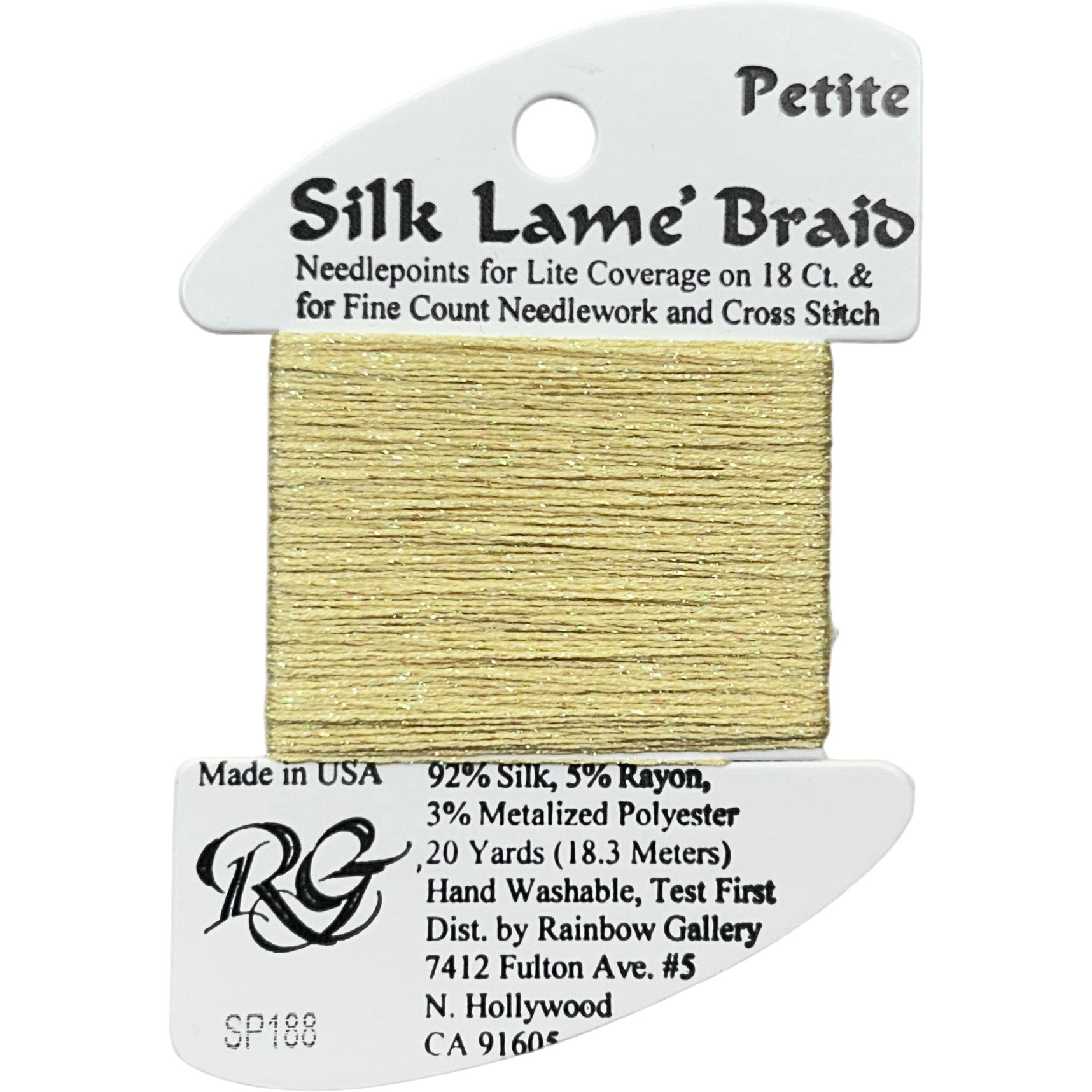 This is Silk Lame Braid Petite from Rainbow Gallery in color 188 Vanilla. Use on 18 mesh for light coverage, or with a floss as a blending filament. 2 strands of Silk Lame Braid Petite are approximately equivalent to one strand of Silk Lame Braid 18.