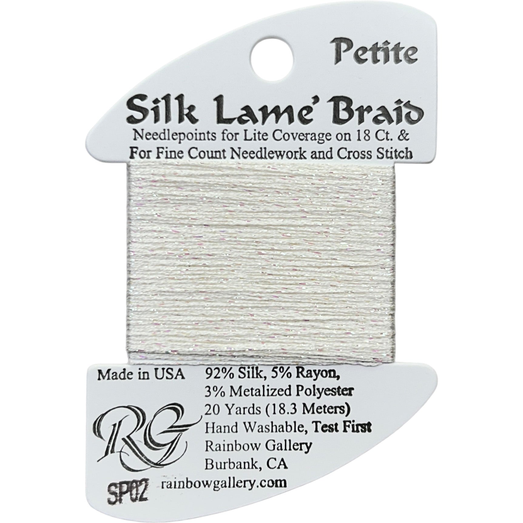 This is Silk Lame Braid Petite from Rainbow Gallery in color 002 White. Use on 18 mesh for light coverage, or with a floss as a blending filament. 2 strands of Silk Lame Braid Petite are approximately equivalent to one strand of Silk Lame Braid 18.