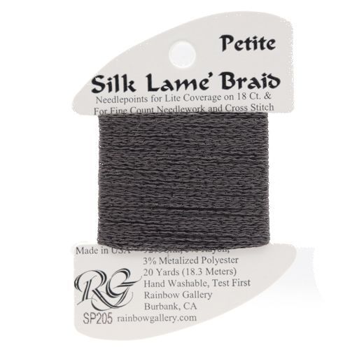 This is Silk Lame Braid Petite from Rainbow Gallery in color 205 Gargoyle. Use on 18 mesh for light coverage, or with a floss as a blending filament. 2 strands of Silk Lame Braid Petite are approximately equivalent to one strand of Silk Lame Braid 18.