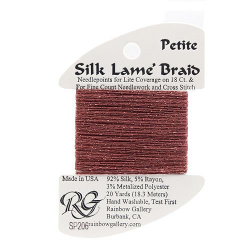 This is Silk Lame Braid Petite from Rainbow Gallery in color 206 Nostalgia Rose. Use on 18 mesh for light coverage, or with a floss as a blending filament. 2 strands of Silk Lame Braid Petite are approximately equivalent to one strand of Silk Lame Braid 18.