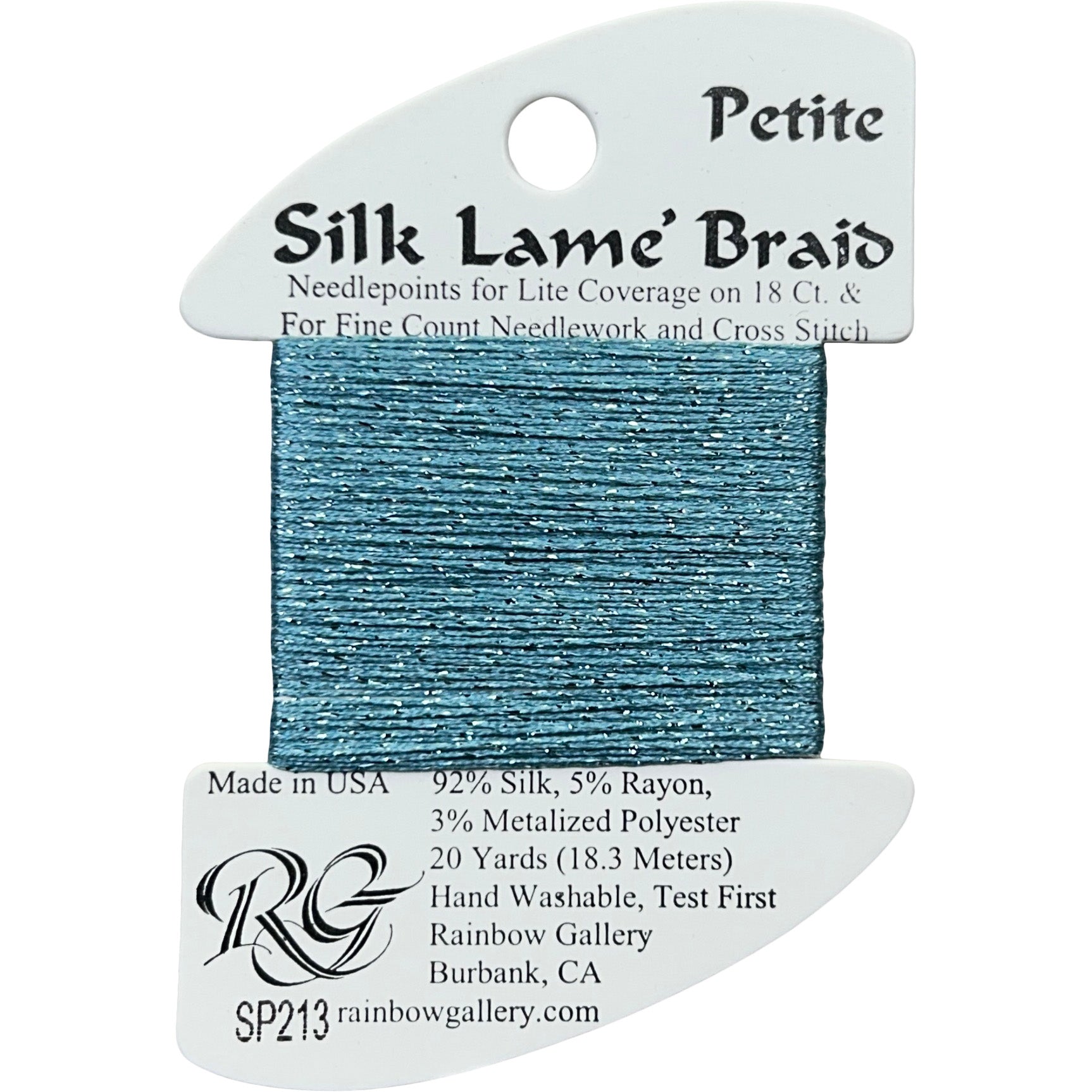 This is Silk Lame Braid Petite from Rainbow Gallery in color 213 Dusty Turquoise. Use on 18 mesh for light coverage, or with a floss as a blending filament. 2 strands of Silk Lame Braid Petite are approximately equivalent to one strand of Silk Lame Braid 18.