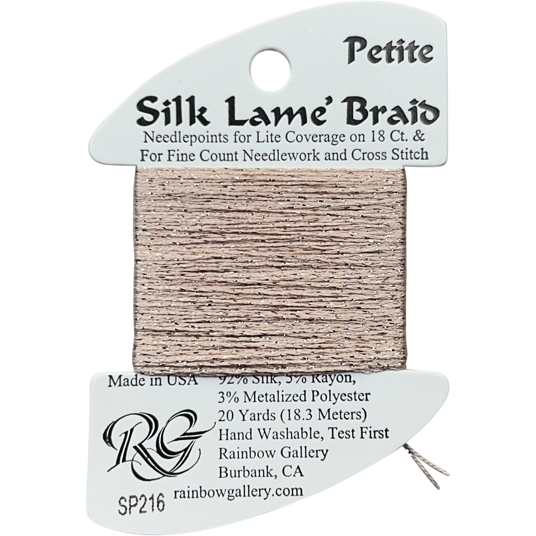 This is Silk Lame Braid Petite from Rainbow Gallery in color 216 Touch of Tan. Use on 18 mesh for light coverage, or with a floss as a blending filament. 2 strands of Silk Lame Braid Petite are approximately equivalent to one strand of Silk Lame Braid 18.
