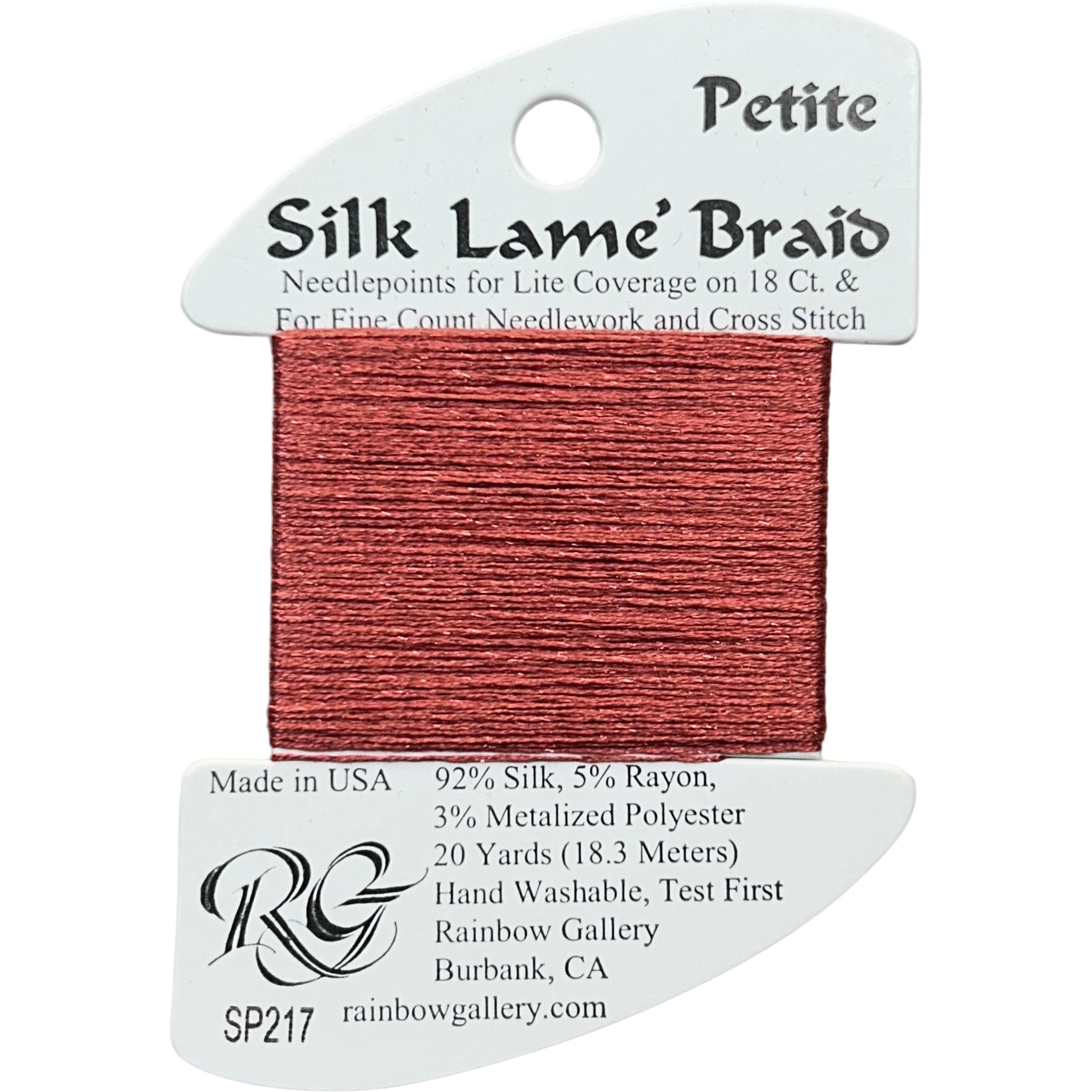 This is Silk Lame Braid Petite from Rainbow Gallery in color 217 Burnt Coral. Use on 18 mesh for light coverage, or with a floss as a blending filament. 2 strands of Silk Lame Braid Petite are approximately equivalent to one strand of Silk Lame Braid 18.