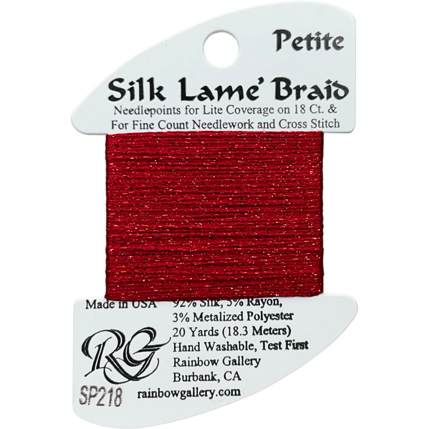 This is Silk Lame Braid Petite from Rainbow Gallery in color 218 Corvette Red. Use on 18 mesh for light coverage, or with a floss as a blending filament. 2 strands of Silk Lame Braid Petite are approximately equivalent to one strand of Silk Lame Braid 18.