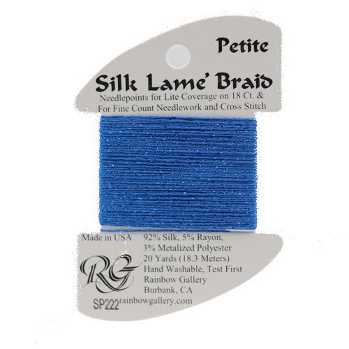 This is Silk Lame Braid Petite from Rainbow Gallery in color 222 Brilliant Blue. Use on 18 mesh for light coverage, or with a floss as a blending filament. 2 strands of Silk Lame Braid Petite are approximately equivalent to one strand of Silk Lame Braid 18.