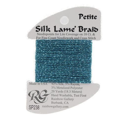 This is Silk Lame Braid Petite from Rainbow Gallery in color 238 Teal Zeal. Use on 18 mesh for light coverage, or with a floss as a blending filament. 2 strands of Silk Lame Braid Petite are approximately equivalent to one strand of Silk Lame Braid 18.
