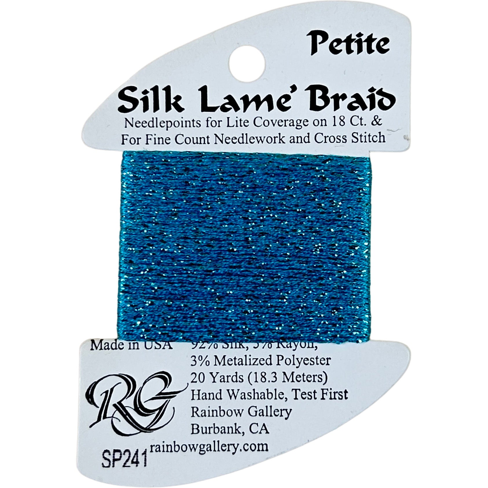 This is Silk Lame Braid Petite from Rainbow Gallery in color 241 Scuba Blue. Use on 18 mesh for light coverage, or with a floss as a blending filament. 2 strands of Silk Lame Braid Petite are approximately equivalent to one strand of Silk Lame Braid 18.