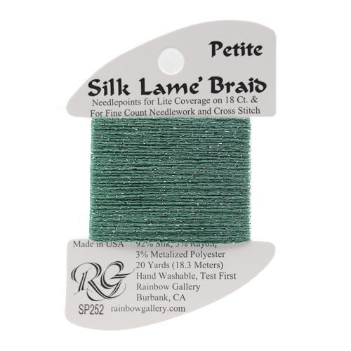 This is Silk Lame Braid Petite from Rainbow Gallery in color 252 Caribbean Green. Use on 18 mesh for light coverage, or with a floss as a blending filament. 2 strands of Silk Lame Braid Petite are approximately equivalent to one strand of Silk Lame Braid 18.