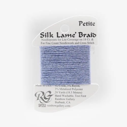 This is Silk Lame Braid Petite from Rainbow Gallery in color 253 Antique Periwinkle. Use on 18 mesh for light coverage, or with a floss as a blending filament. 2 strands of Silk Lame Braid Petite are approximately equivalent to one strand of Silk Lame Braid 18.