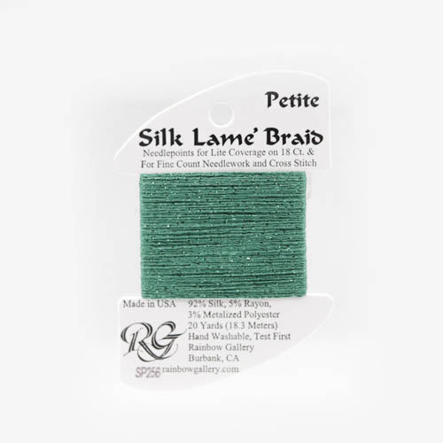 This is Silk Lame Braid Petite from Rainbow Gallery in color 256 Desert Sage. Use on 18 mesh for light coverage, or with a floss as a blending filament. 2 strands of Silk Lame Braid Petite are approximately equivalent to one strand of Silk Lame Braid 18.