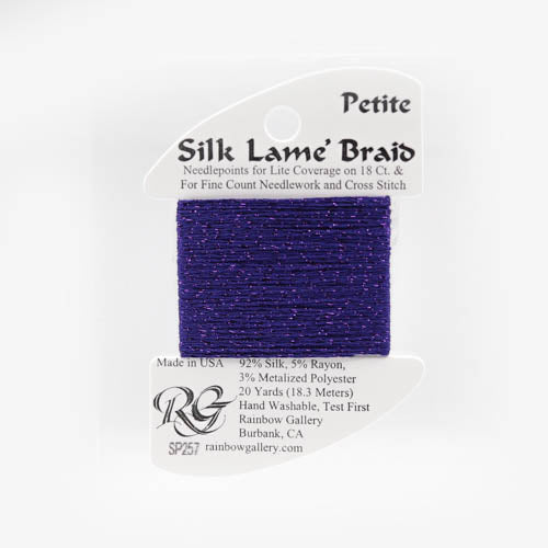 This is Silk Lame Braid Petite from Rainbow Gallery in color 257 Boysenberry. Use on 18 mesh for light coverage, or with a floss as a blending filament. 2 strands of Silk Lame Braid Petite are approximately equivalent to one strand of Silk Lame Braid 18.