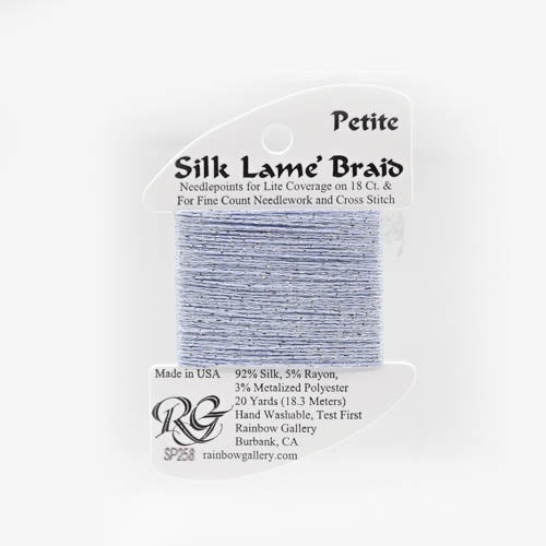 This is Silk Lame Braid Petite from Rainbow Gallery in color 258 Gentle Gray. Use on 18 mesh for light coverage, or with a floss as a blending filament. 2 strands of Silk Lame Braid Petite are approximately equivalent to one strand of Silk Lame Braid 18.