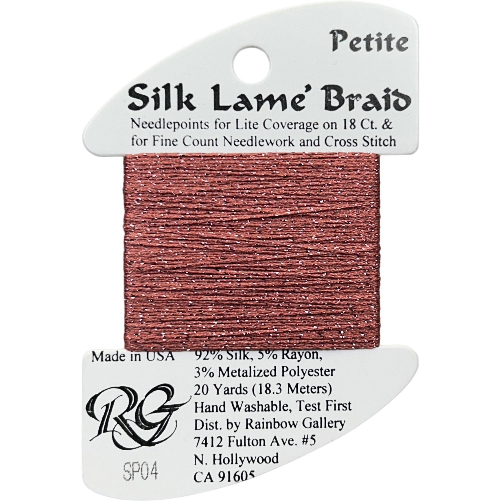 This is Silk Lame Braid Petite from Rainbow Gallery in color 004 Antique Rose. Use on 18 mesh for light coverage, or with a floss as a blending filament. 2 strands of Silk Lame Braid Petite are approximately equivalent to one strand of Silk Lame Braid 18.