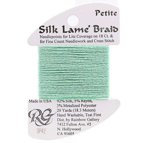 This is Silk Lame Braid Petite from Rainbow Gallery in color 042 Mint. Use on 18 mesh for light coverage, or with a floss as a blending filament. 2 strands of Silk Lame Braid Petite are approximately equivalent to one strand of Silk Lame Braid 18.