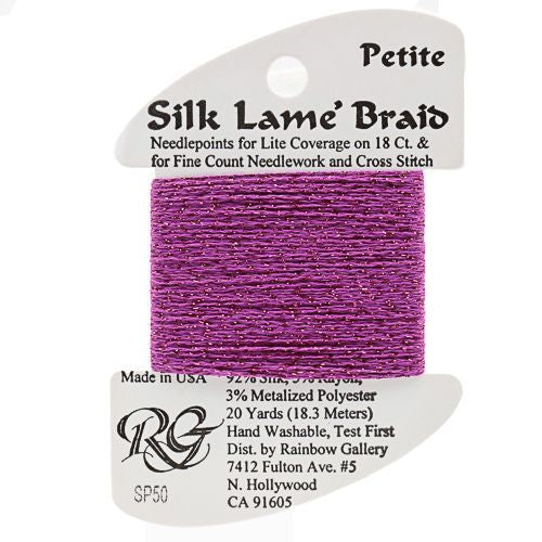 This is Silk Lame Braid Petite from Rainbow Gallery in color 050 Fuchsia. Use on 18 mesh for light coverage, or with a floss as a blending filament. 2 strands of Silk Lame Braid Petite are approximately equivalent to one strand of Silk Lame Braid 18.