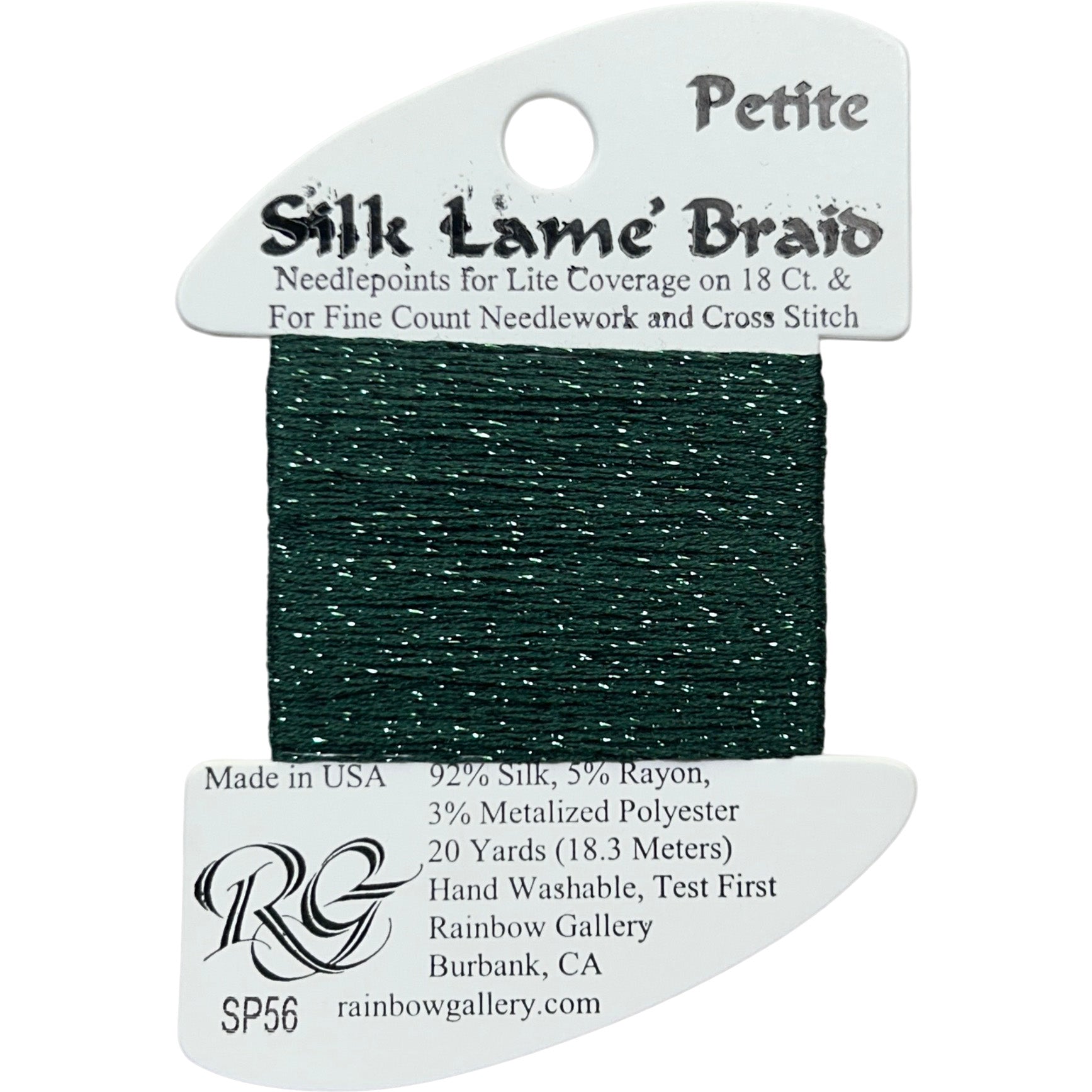This is Silk Lame Braid Petite from Rainbow Gallery in color 056 Forest Green. Use on 18 mesh for light coverage, or with a floss as a blending filament. 2 strands of Silk Lame Braid Petite are approximately equivalent to one strand of Silk Lame Braid 18.
