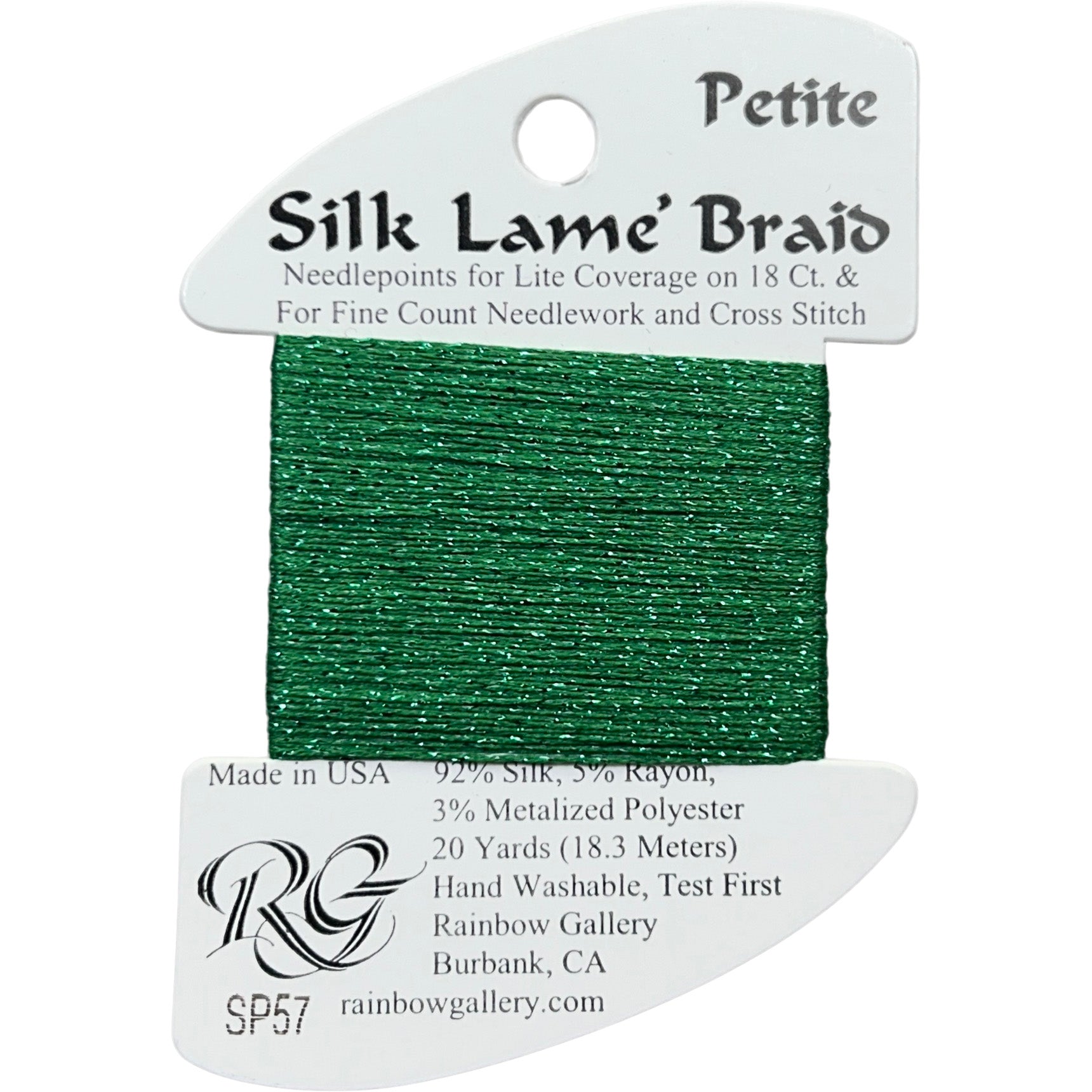 This is Silk Lame Braid Petite from Rainbow Gallery in color 057 Christmas Green. Use on 18 mesh for light coverage, or with a floss as a blending filament. 2 strands of Silk Lame Braid Petite are approximately equivalent to one strand of Silk Lame Braid 18.