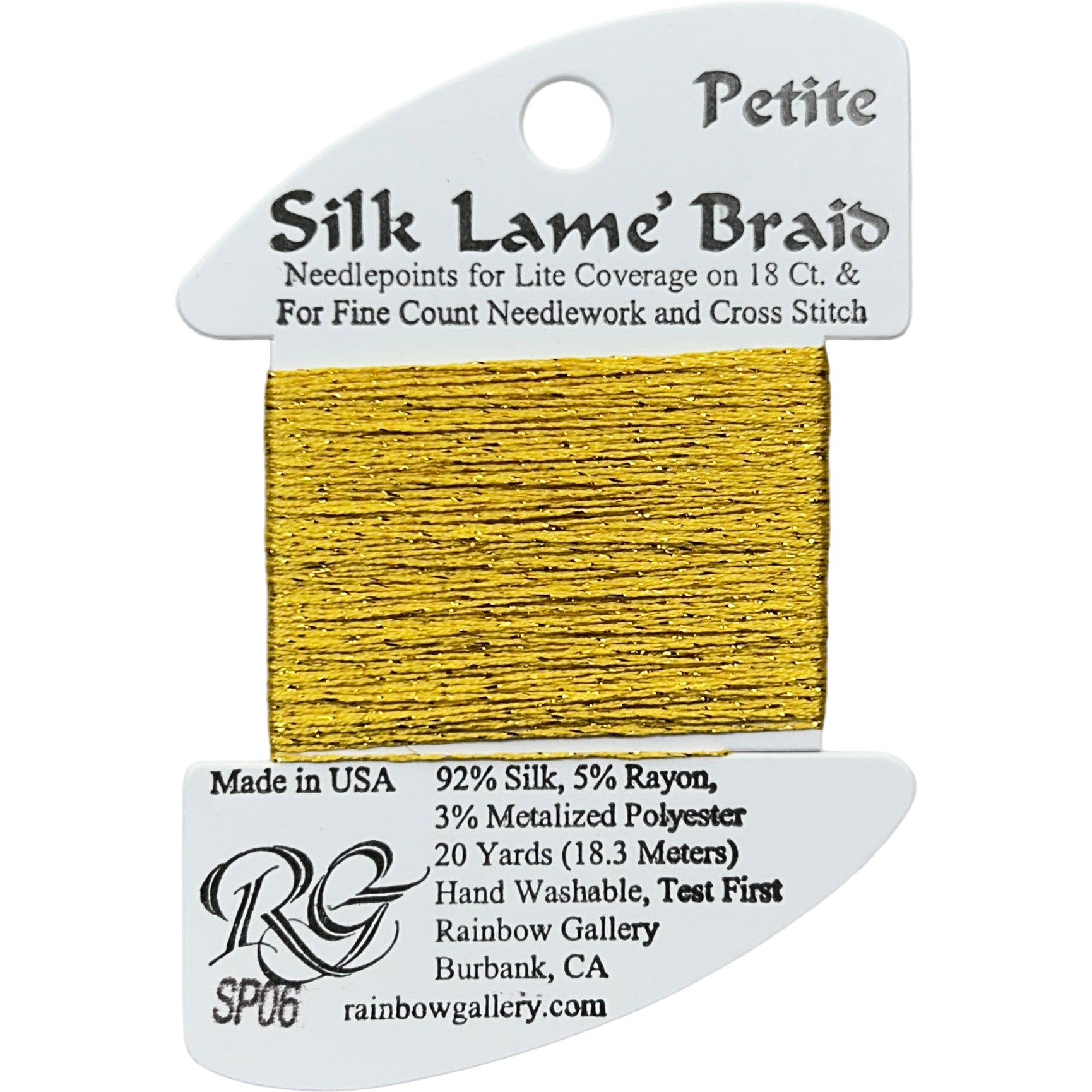 This is Silk Lame Braid Petite from Rainbow Gallery in color 006 Gold. Use on 18 mesh for light coverage, or with a floss as a blending filament. 2 strands of Silk Lame Braid Petite are approximately equivalent to one strand of Silk Lame Braid 18.