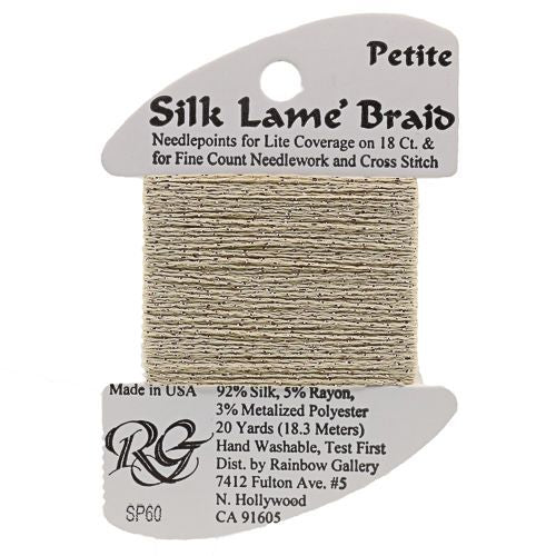 This is Silk Lame Braid Petite from Rainbow Gallery in color 060 Camel. Use on 18 mesh for light coverage, or with a floss as a blending filament. 2 strands of Silk Lame Braid Petite are approximately equivalent to one strand of Silk Lame Braid 18.