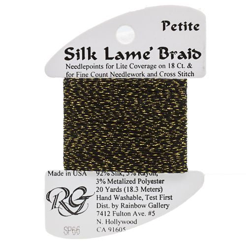 This is Silk Lame Braid Petite from Rainbow Gallery in color 066 Antique Gold. Use on 18 mesh for light coverage, or with a floss as a blending filament. 2 strands of Silk Lame Braid Petite are approximately equivalent to one strand of Silk Lame Braid 18.