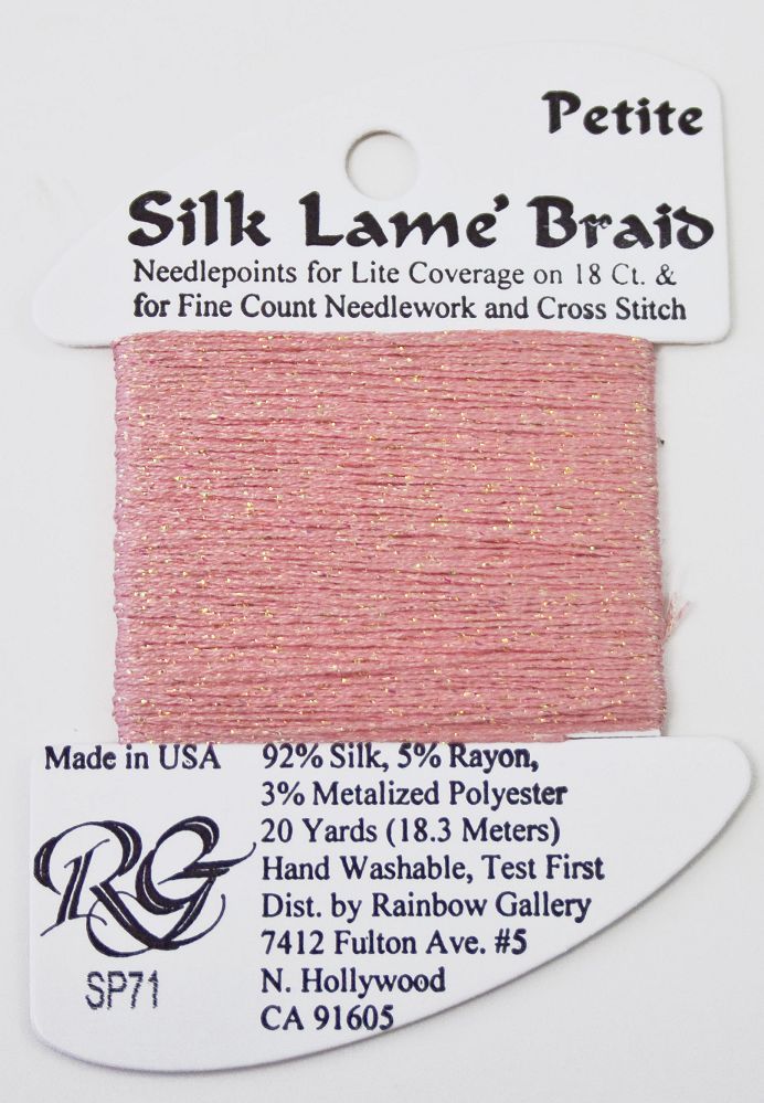 This is Silk Lame Braid Petite from Rainbow Gallery in color 071 Peach. Use on 18 mesh for light coverage, or with a floss as a blending filament. 2 strands of Silk Lame Braid Petite are approximately equivalent to one strand of Silk Lame Braid 18.