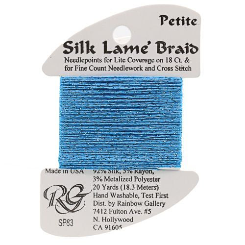 This is Silk Lame Braid Petite from Rainbow Gallery in color 083 Blue Turquoise. Use on 18 mesh for light coverage, or with a floss as a blending filament. 2 strands of Silk Lame Braid Petite are approximately equivalent to one strand of Silk Lame Braid 18.
