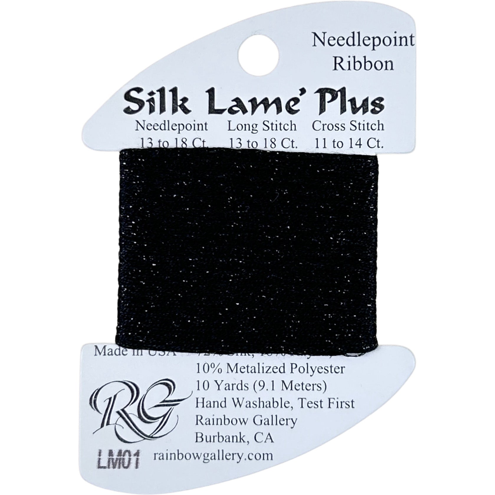 This is Silk Lame Plus from Rainbow Gallery in color 1 Black. Use as-is on 13 or 18 mesh. Comparable to Neon Rays Plus, but made with silk instead of rayon.