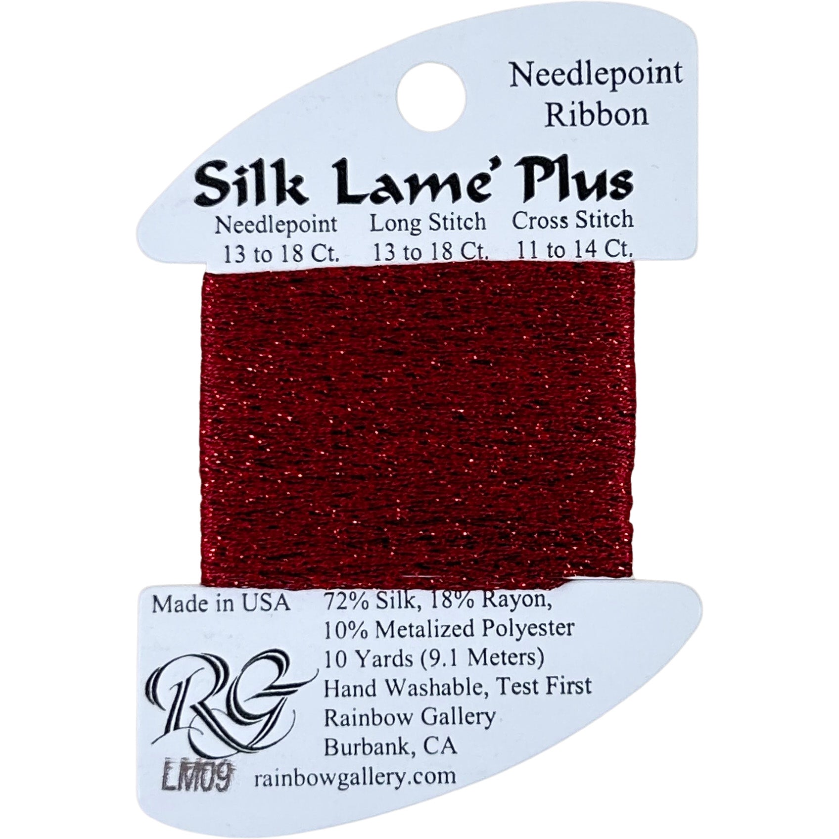 This is Silk Lame Plus from Rainbow Gallery in color 9 Dark Red. Use as-is on 13 or 18 mesh. Comparable to Neon Rays Plus, but made with silk instead of rayon.