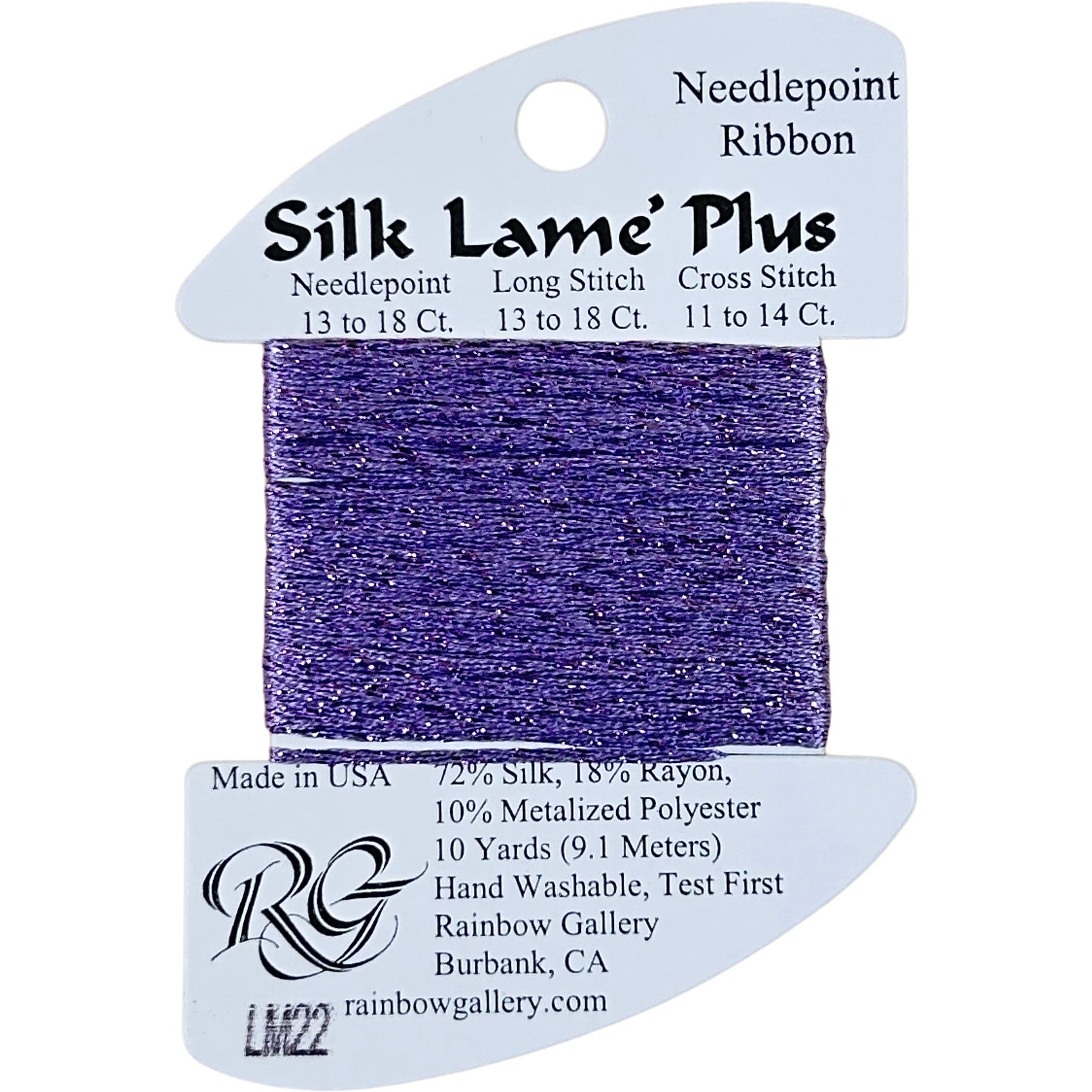 This is Silk Lame Plus from Rainbow Gallery in color 22 Lavender. Use as-is on 13 or 18 mesh. Comparable to Neon Rays Plus, but made with silk instead of rayon.
