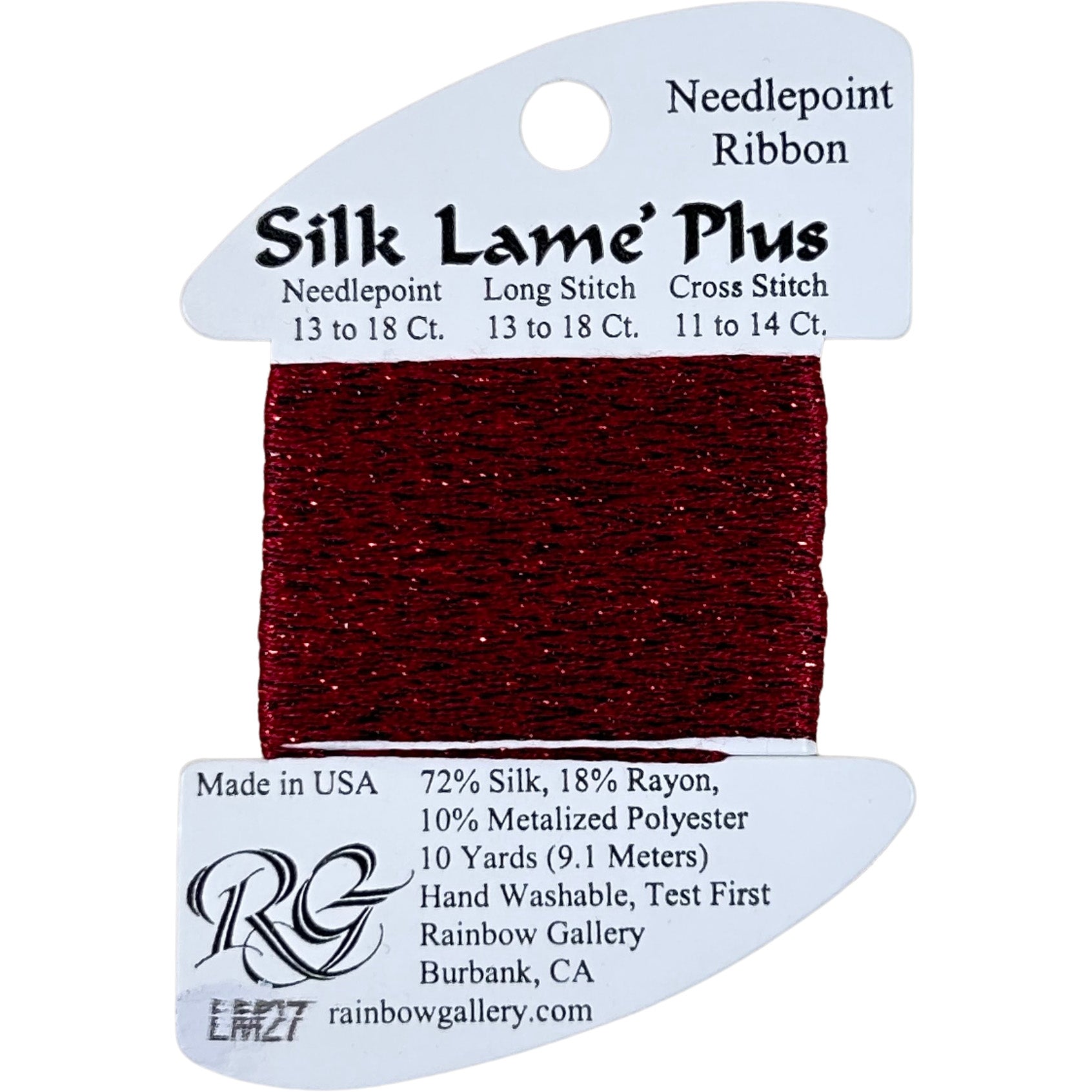 This is Silk Lame Plus from Rainbow Gallery in color 27 Garnet. Use as-is on 13 or 18 mesh. Comparable to Neon Rays Plus, but made with silk instead of rayon.