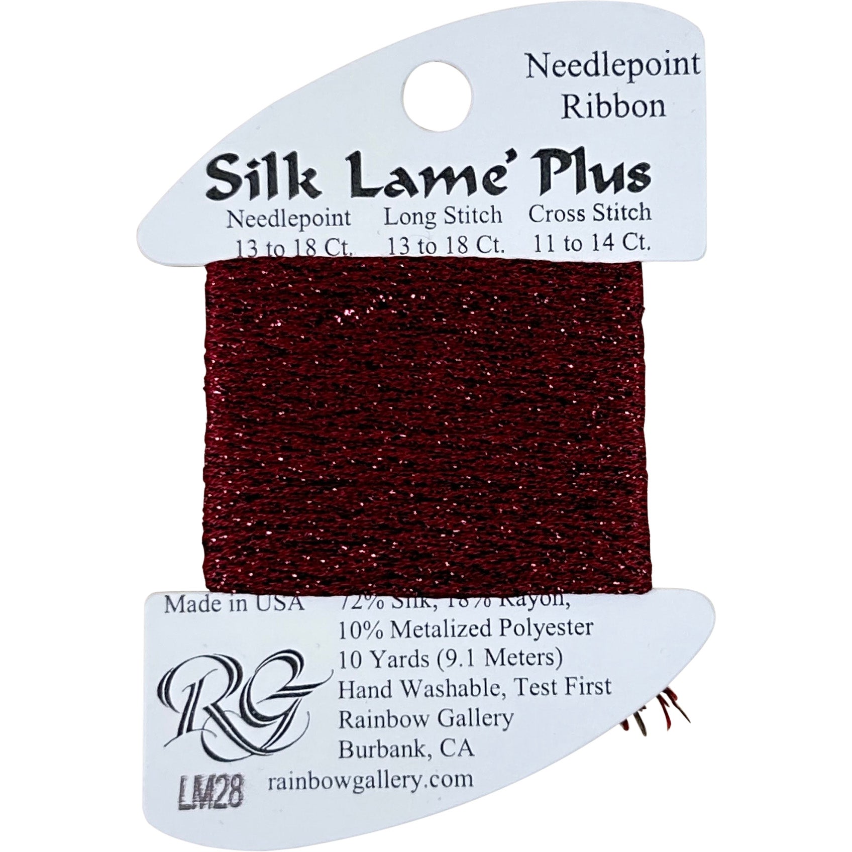 This is Silk Lame Plus from Rainbow Gallery in color 28 Burgundy. Use as-is on 13 or 18 mesh. Comparable to Neon Rays Plus, but made with silk instead of rayon.