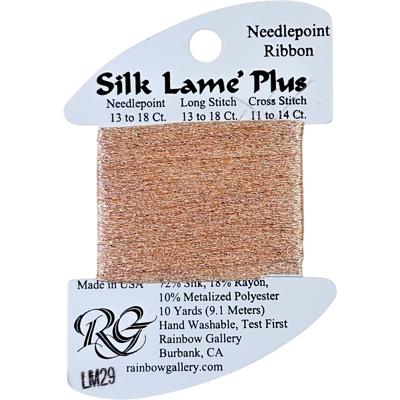 This is Silk Lame Plus from Rainbow Gallery in color 29 Chiffon. Use as-is on 13 or 18 mesh. Comparable to Neon Rays Plus, but made with silk instead of rayon.