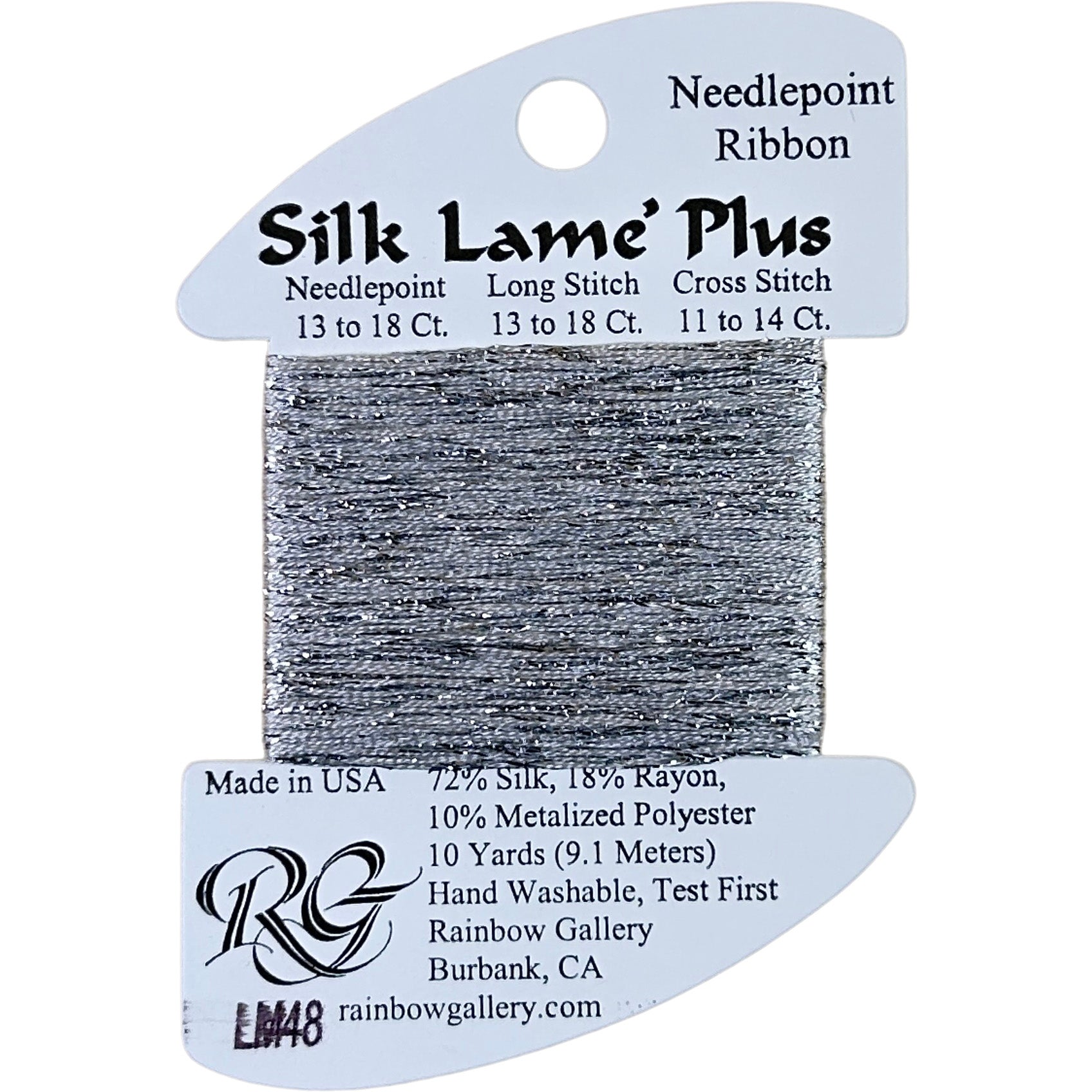 This is Silk Lame Plus from Rainbow Gallery in color 48 Silver. Use as-is on 13 or 18 mesh. Comparable to Neon Rays Plus, but made with silk instead of rayon.
