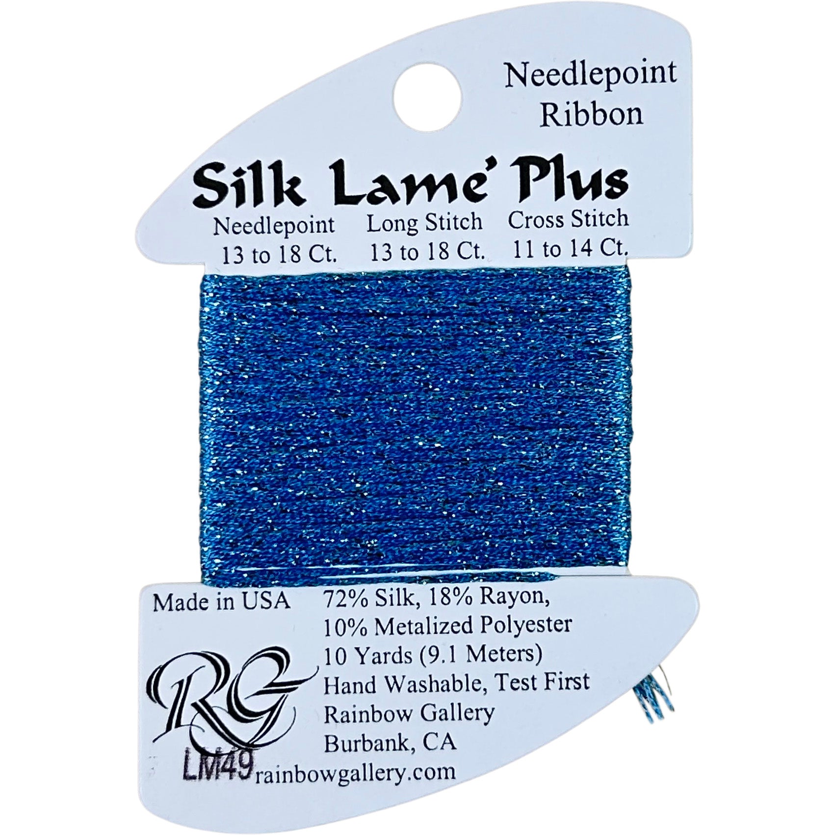 This is Silk Lame Plus from Rainbow Gallery in color 49 China Blue. Use as-is on 13 or 18 mesh. Comparable to Neon Rays Plus, but made with silk instead of rayon.