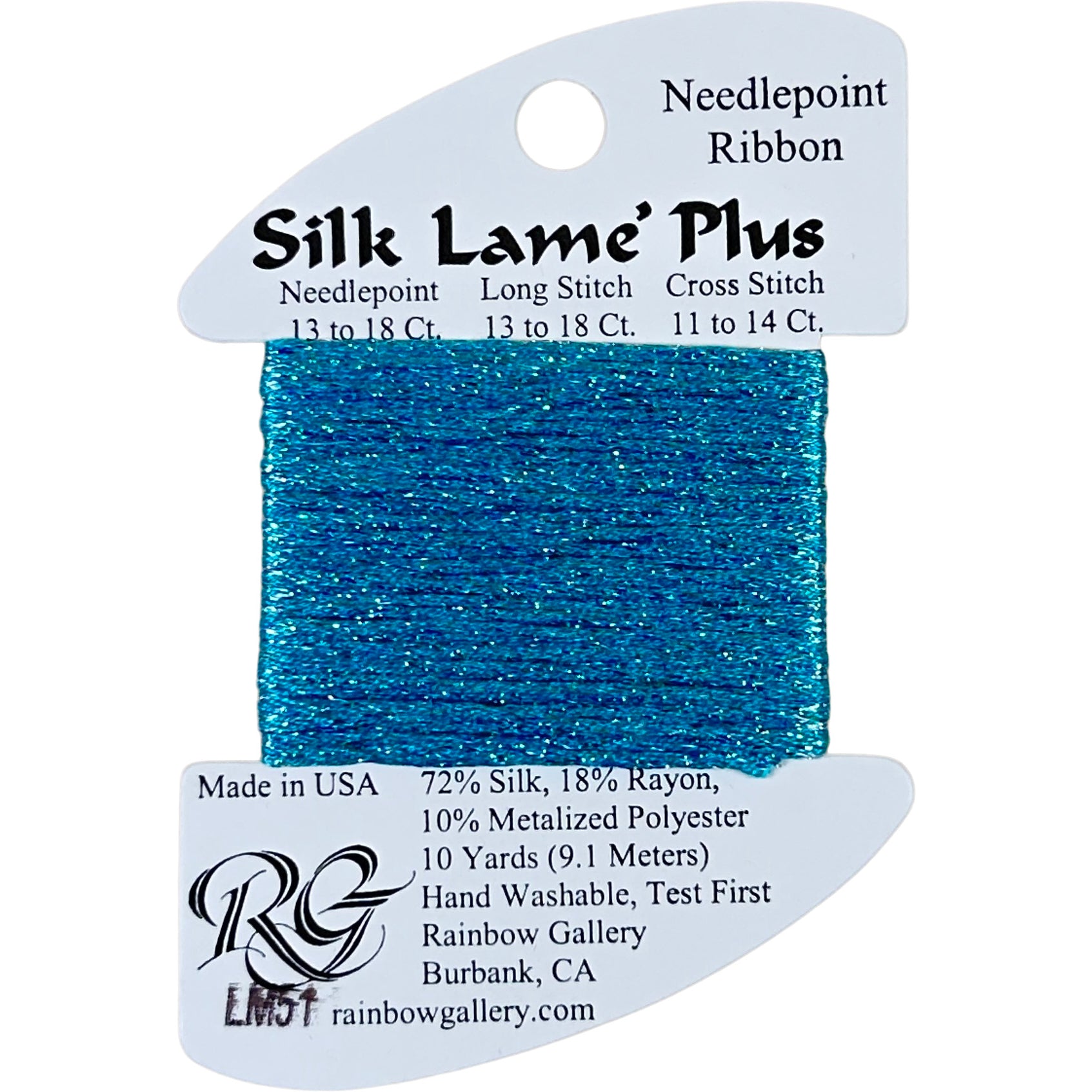 This is Silk Lame Plus from Rainbow Gallery in color 51 Turquoise. Use as-is on 13 or 18 mesh. Comparable to Neon Rays Plus, but made with silk instead of rayon.