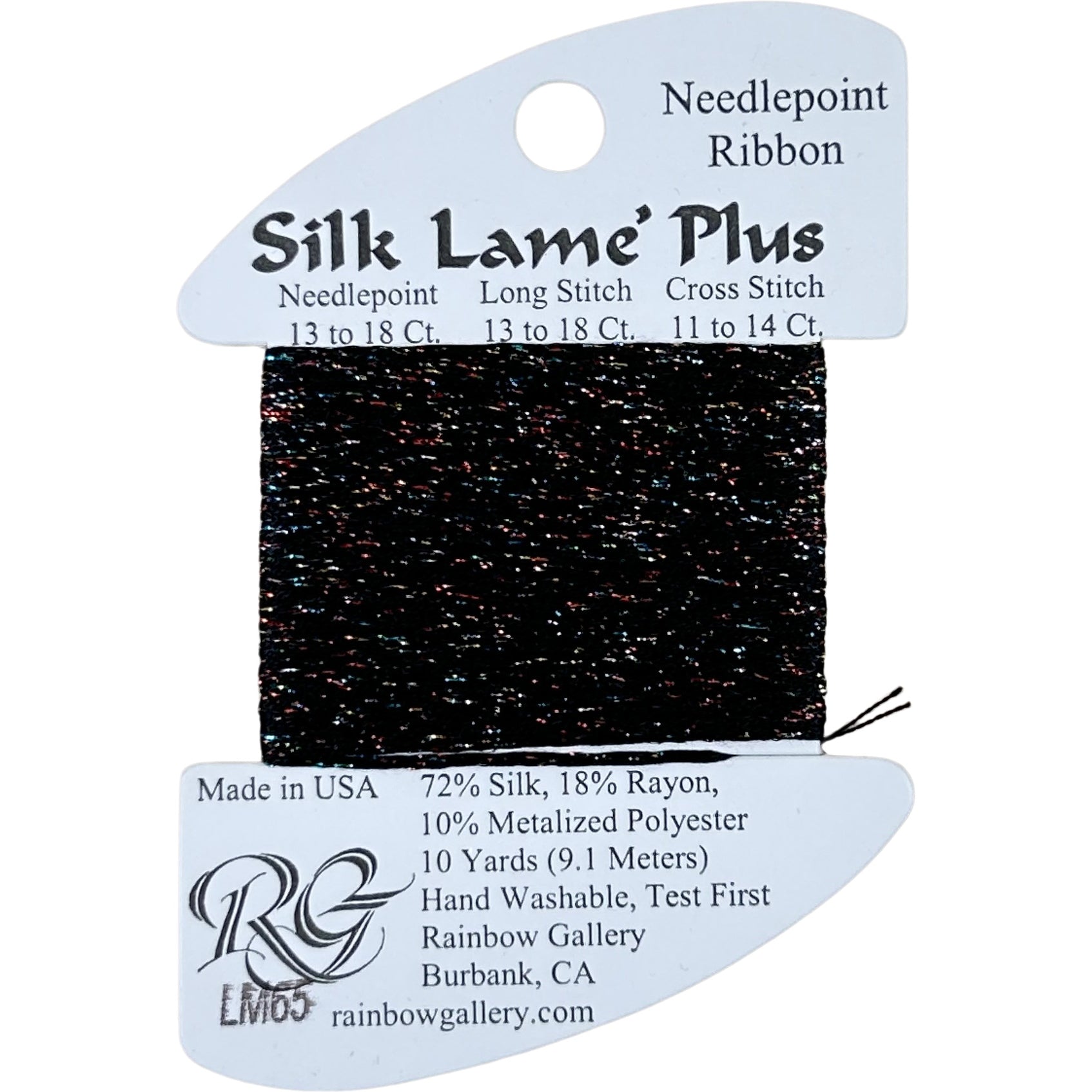 This is Silk Lame Plus from Rainbow Gallery in color 65 Black Sparkle. Use as-is on 13 or 18 mesh. Comparable to Neon Rays Plus, but made with silk instead of rayon.