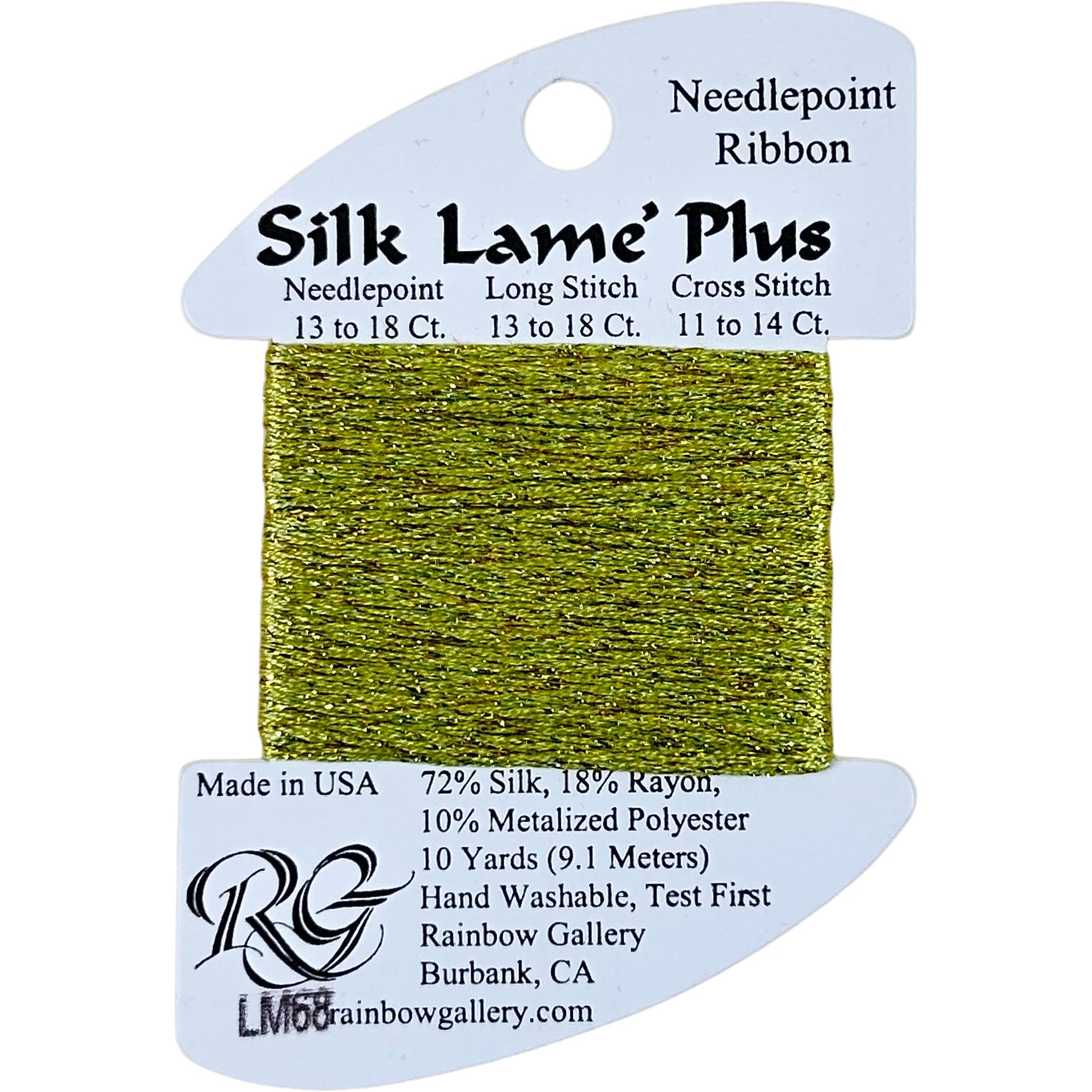 This is Silk Lame Plus from Rainbow Gallery in color 68 Pale Avocado. Use as-is on 13 or 18 mesh. Comparable to Neon Rays Plus, but made with silk instead of rayon.