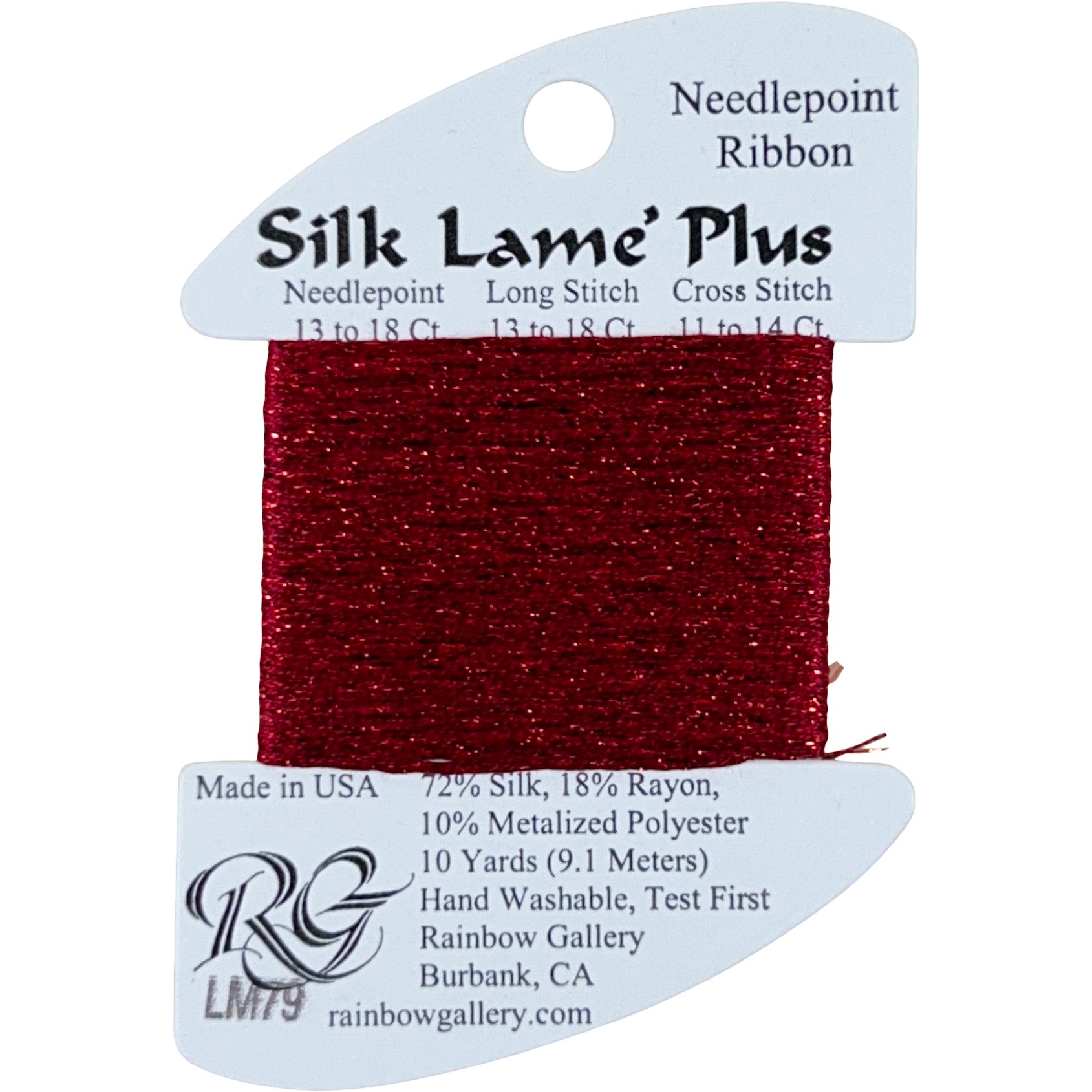 This is Silk Lame Plus from Rainbow Gallery in color 79 Dark Cherry. Use as-is on 13 or 18 mesh. Comparable to Neon Rays Plus, but made with silk instead of rayon.