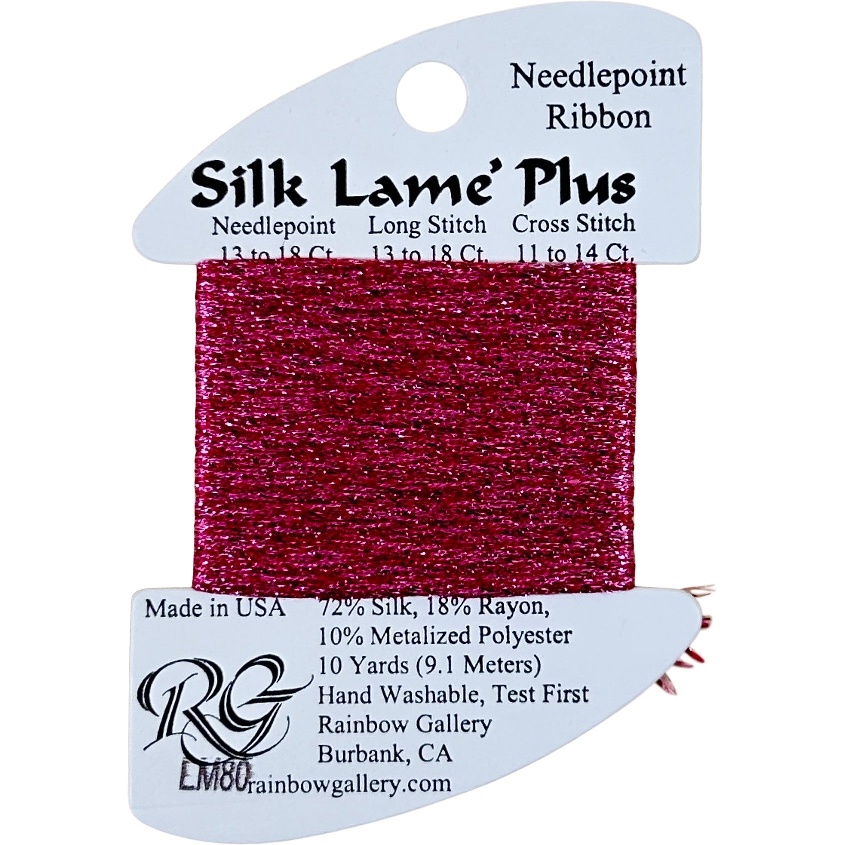 This is Silk Lame Plus from Rainbow Gallery in color 80 Pink Carnation. Use as-is on 13 or 18 mesh. Comparable to Neon Rays Plus, but made with silk instead of rayon.