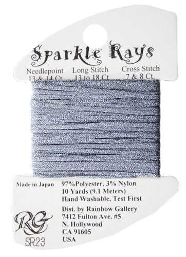 This is Sparkle Rays from Rainbow Gallery in color 23 Pewter. Use as-is on 13 mesh. This line features several vivid neons, perfect for brightening up your projects!