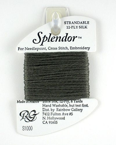 This is Splendor from Rainbow Gallery in color 1000 Very Dark Taupe. A soft stranded silk from Rainbow Gallery. Use 6 strands on 13 mesh, 3 or 4 strands on 18 mesh.
