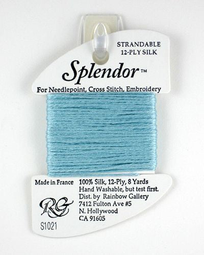 This is Splendor from Rainbow Gallery in color 1021 Lite Aqua. A soft stranded silk from Rainbow Gallery. Use 6 strands on 13 mesh, 3 or 4 strands on 18 mesh.